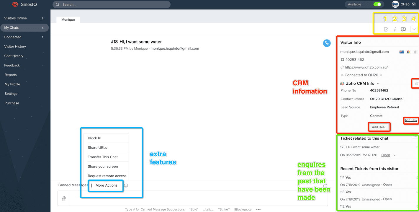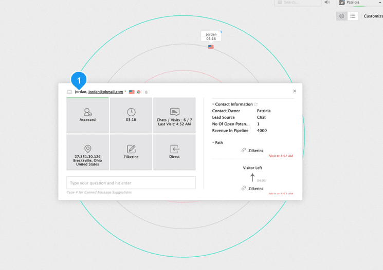 Here you can learn view a Visitor Footprint in real-time and assess a visitor's interests before initiating chat. All CRM and support information of a visitor, if available, is also displayed here.The more they interact with you the more data is collected. You can communicate with them directly see their chat history, see where they are from and what device they are using.The more they interact with you the more data is collected. You can communicate with them directly see their chat history, see where they are from and what device they are using.