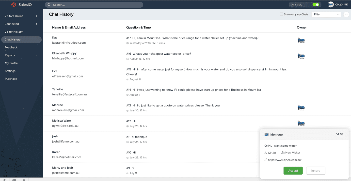 When a customer uses our chat function on the website, you will be notified by Sales IQ with a ringing sound. A pop up will appear saying who the customer is and thier basic information. You then need to press ACCEPT to start to engage with the customer live. See image below.